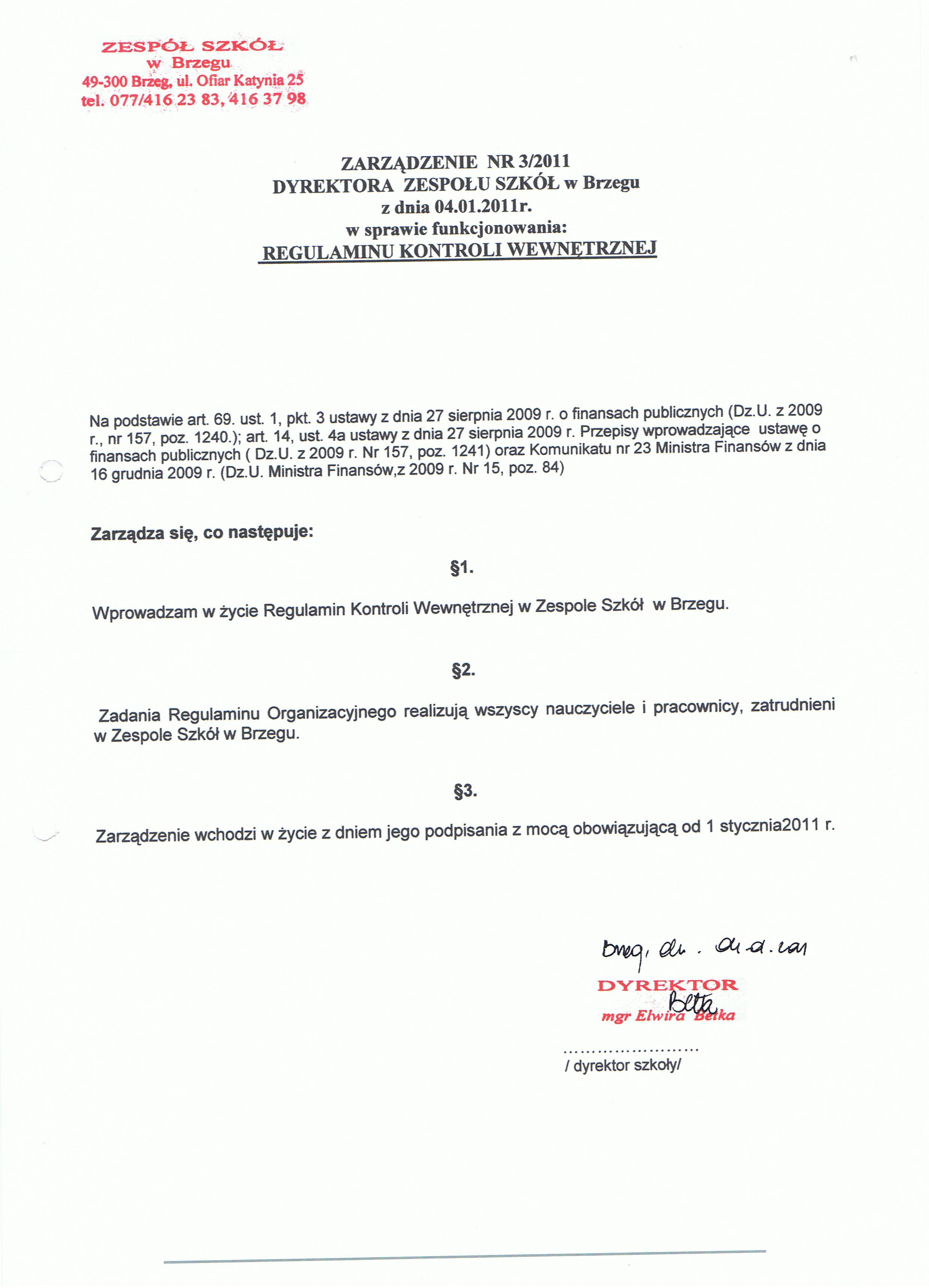 Zarządzanie 3/2011 w sprawie funkcjonowania regulaminu kontroli wewnętrznej